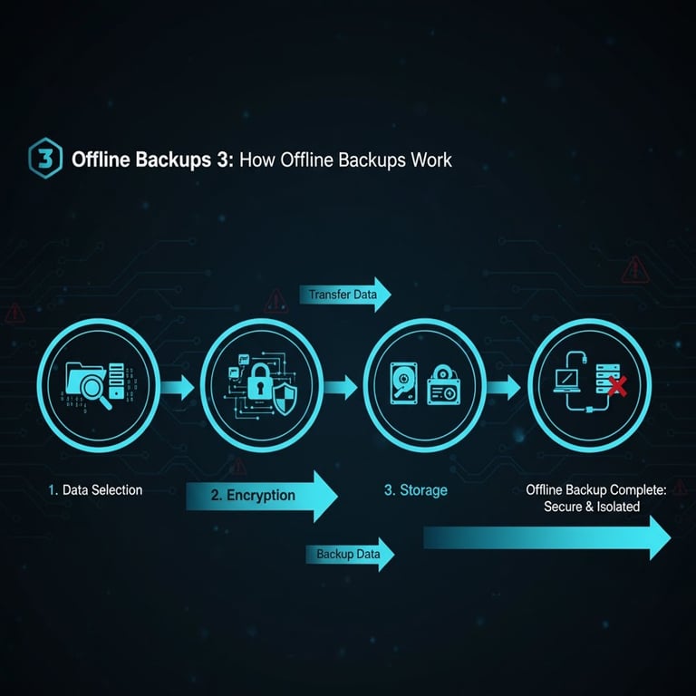 Offline backups are copies of critical data stored physically and disconnected from the internet or network. This keeps data safe even if your systems are hacked or infected. Common storage options include external hard drives, USB drives, magnetic tapes, or other devices that are only connected during the backup process. Once complete, these backups are stored securely, preventing cybercriminals from accessing them.