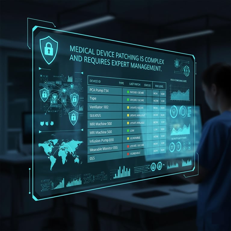 Medical device patching is challenging due to device complexity, downtime risks, regulatory hurdles, and evolving cyber threats. Ignoring these vulnerabilities directly impacts patient safety and hospital security.